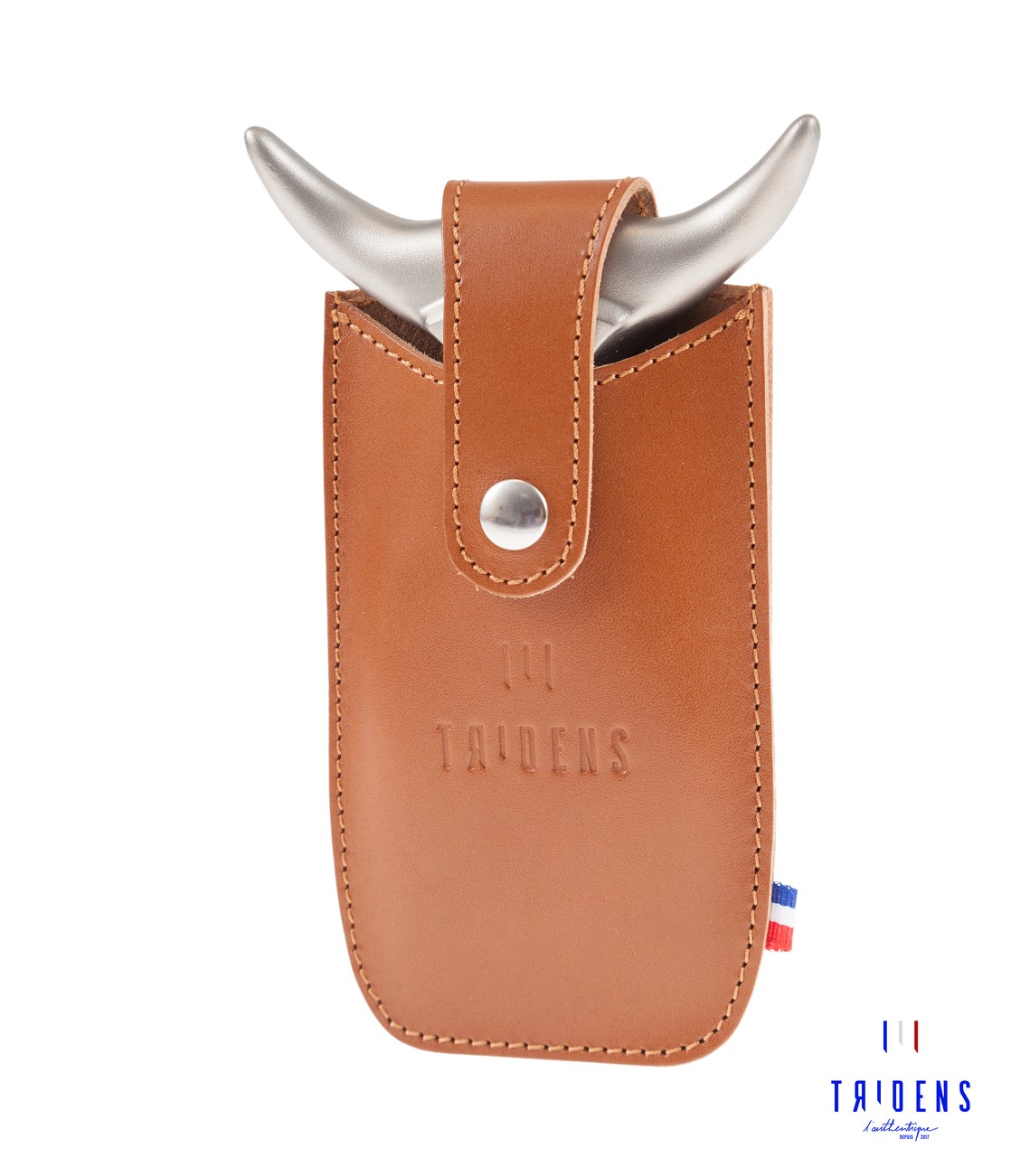Was ist das denn? Da ragen doch zwei Hörner heraus! Wird hier ein stählerner Stier gezähmt? Dank dieser genialen Hülle aus pflanzlich gegerbtem europäischem Rindsleder könnte man das tatsächlich denken. Doch Scherz beiseite, tatsächlich verbirgt der französische Hersteller Tridens dahinter eine Fleischgabel aus unverwüstlichem rostfreiem 316L-Stahl. Sie ist ebenfalls bei uns erhältlich. Wählbar ist das Lederetui in braun oder schwarz. Dank seines Designs und einer Schlaufe auf der Rückseite lässt es sich auch am Gürtel befestigen. Vive La France!